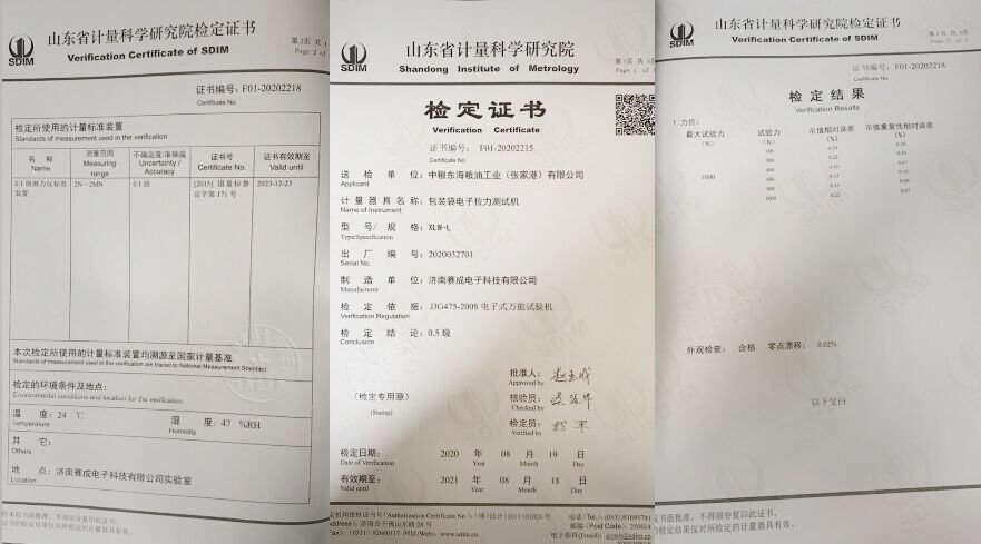 為了更好的交付這批設(shè)備,確保設(shè)備測(cè)試數(shù)據(jù)的準(zhǔn)確性,濟(jì)南賽成儀器向山東省計(jì)量科學(xué)研究院提出了檢定申請(qǐng)。依據(jù)JJG475-2008電子式萬(wàn)能試驗(yàn)機(jī)的檢定規(guī)程,省計(jì)量院工作人員對(duì)XLW-L包裝袋電子拉力試驗(yàn)機(jī)的精度和誤差等進(jìn)行了檢定,經(jīng)檢定結(jié)論達(dá)到0.5級(jí),檢定結(jié)果合格。2020年8月9日獲得山東省計(jì)量科學(xué)研究院頒發(fā)的檢定證書(shū),獲得的這份檢定證書(shū),進(jìn)一步證明了濟(jì)南賽成儀器符合預(yù)定要求和質(zhì)量要求,測(cè)量結(jié)果準(zhǔn)確,儀器持續(xù)可靠,性能穩(wěn)定。